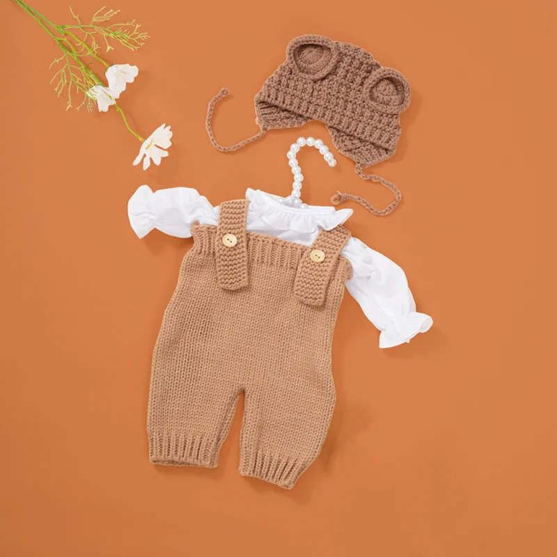 Habillez votre Bébé Reborn avec un style intemporel grâce à la tenue Salopette Beige. Conçue avec soin pour offrir à votre poupée un look à la fois classique et adorable, cette tenue associe une salopette en tricot doux, une chemise blanche délicate et un bonnet assorti en crochet avec des oreilles décoratives. Idéale pour les poupées Bébé Reborn de 55 cm, elle est parfaite pour des séances photo ou pour enrichir la garde-robe de votre collection.