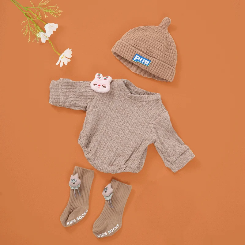 - Ensemble complet : Comprend un pull beige côtelé au design soigné, un bonnet assorti avec un détail « Plug », et des chaussettes mignonnes avec des motifs animaliers.