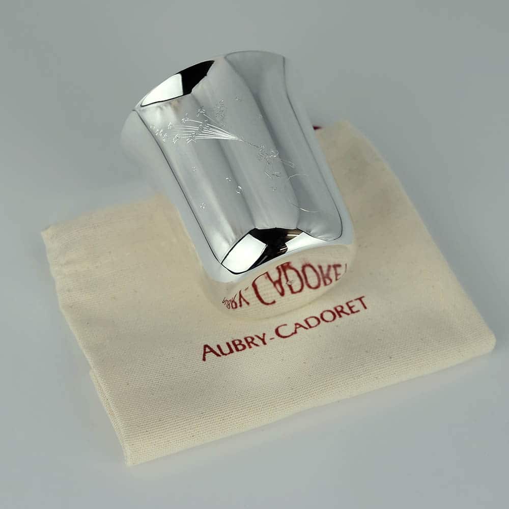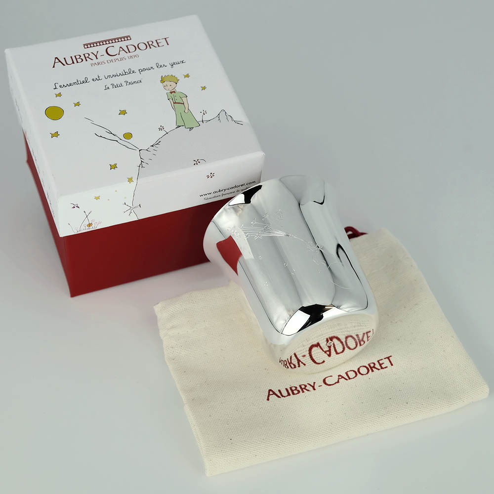 Timbale légèrement évasée et ornée d’une gravure du Petit Prince de fabrication française réalisée en métal argenté, la Maison Aubry-Cadoret en détient l’exclusivité sous licence. Cette pièce d’orfèvrerie mesure 7 cm de hauteur pour 6.5 cm de diamètre et pèse environ 88 grammes. Vous avez la possibilité de faire graver un prénom et/ou une date sur cette timbale pour enfant afin de la personnaliser et de la rendre unique. Elles sont disponibles sous 24h et expédiées dans une boîte rouge siglée Aubry-Cadoret.