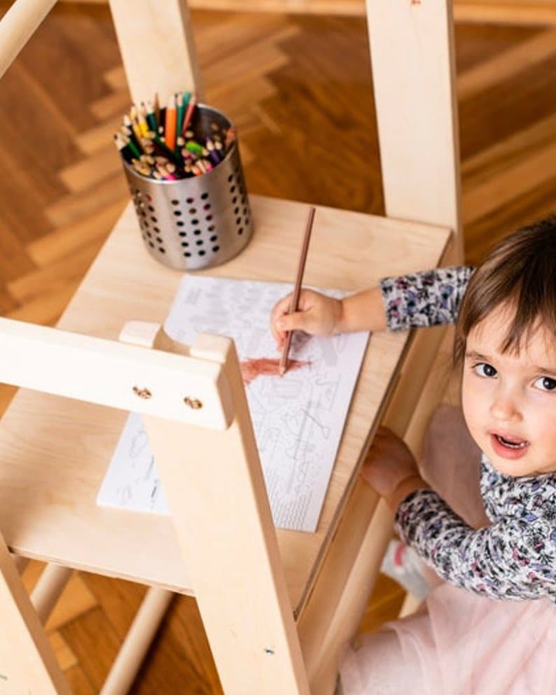 La tour d’aide est un accessoire que tous les foyers devraient posséder. La possibilité de la moduler en bureau donnera envie à votre enfant de l’utiliser tous les jours.