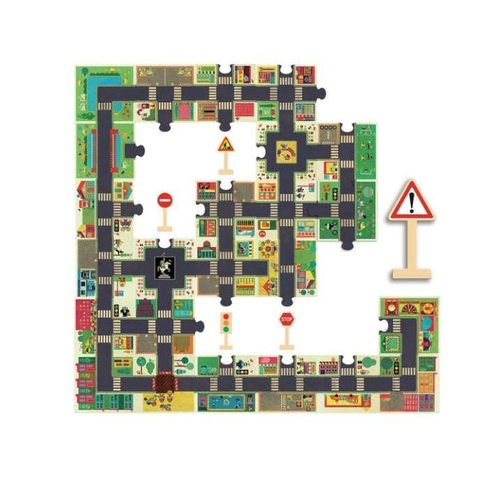 Double jeu pour ce super jouet !!! D’abord il faudra réaliser un puzzle représentant une ville avec des routes sur lesquelles on pourra installer des panneaux de signalisation ! Ensuite, trouver quelques petites voitures pour investir les lieux et … ça roule !!!